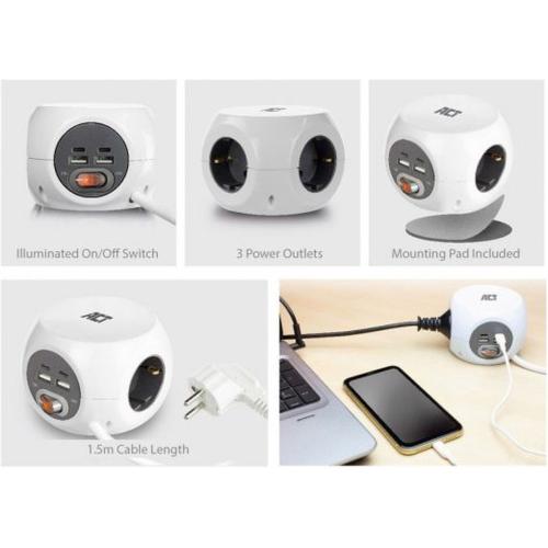 De kubusvormige stekkerdoos heeft drie stopcontacten voor het aansluiten van elektrische apparaten. De vier USB-poorten (2x USB-C en 2x USB-A) zijn geschikt voor het laden van smartphones en tablets met een maximale belasting van 3.4A/17W.